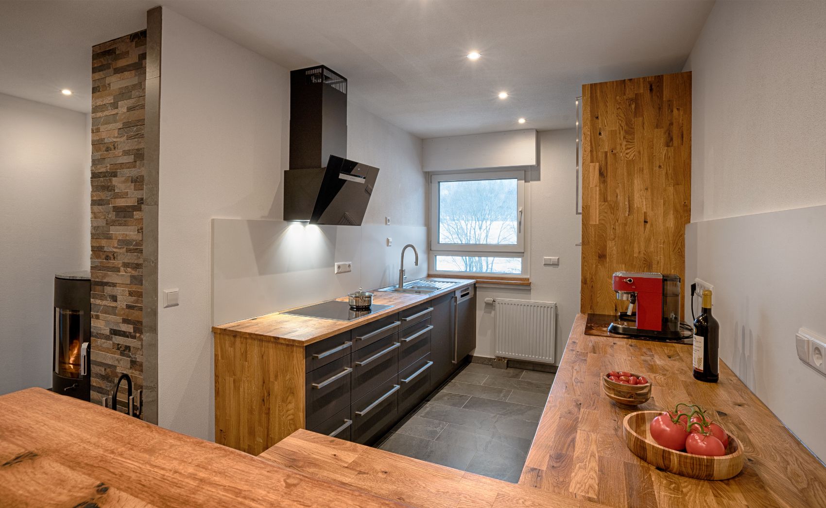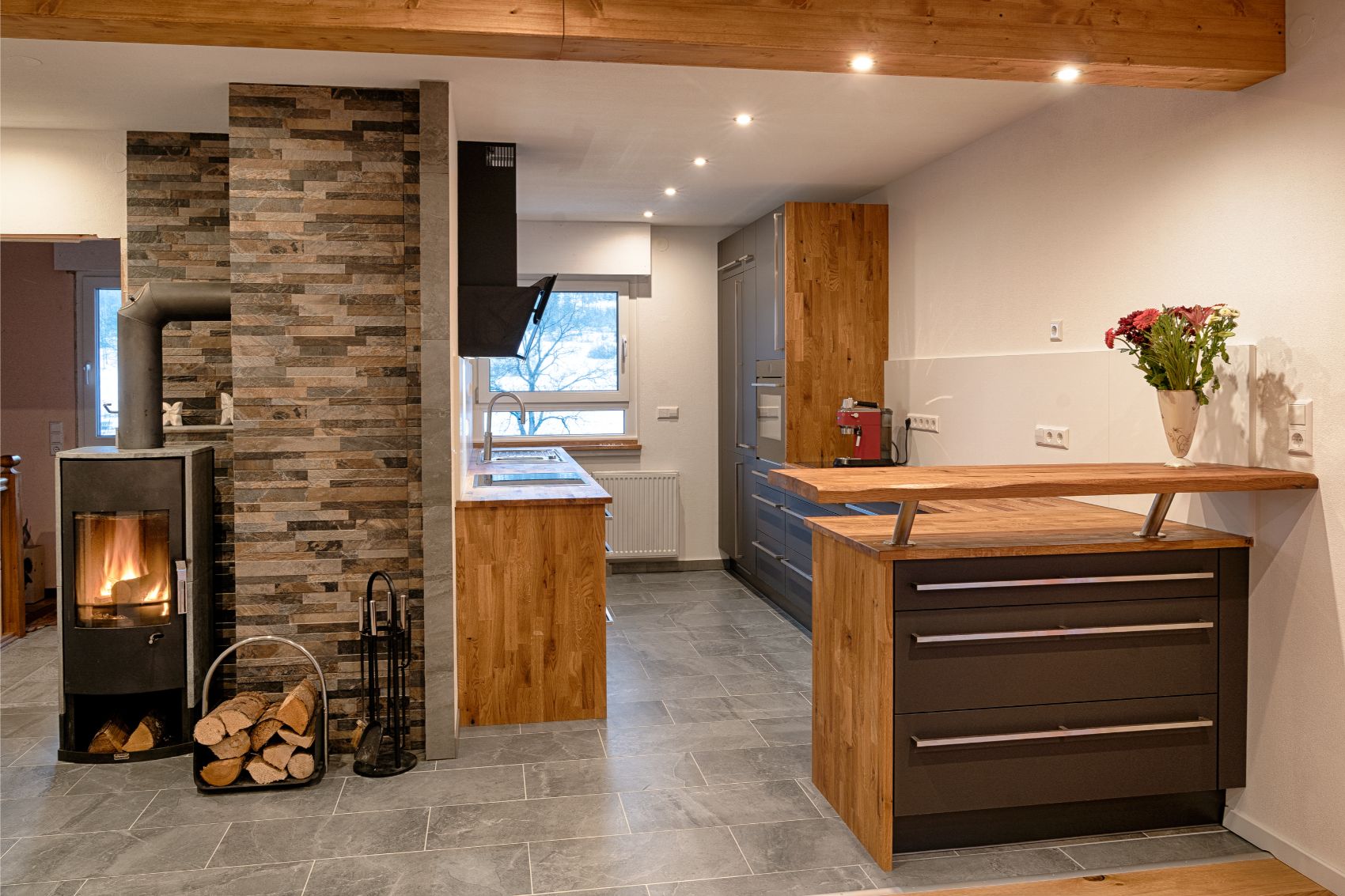 Diese moderne Einbauküche in Lenzkirch besticht durch eine harmonische Materialkombination, die rustikale Gemütlichkeit mit zeitgemäßem Küchendesign vereint. Die markante Altholz-Optik der Arbeitsplatten und Seitenwangen bildet einen warmen Kontrast zu den geradlinigen, schiefergrauen Fronten mit ihren eleganten Edelstahl-Stangengriffen. Ein besonderer Blickfang ist die halbhohe Trennwand in Steinoptik, die den Kochbereich fließend vom Wohnraum abgrenzt und durch den integrierten Kaminofen eine behagliche Atmosphäre schafft.