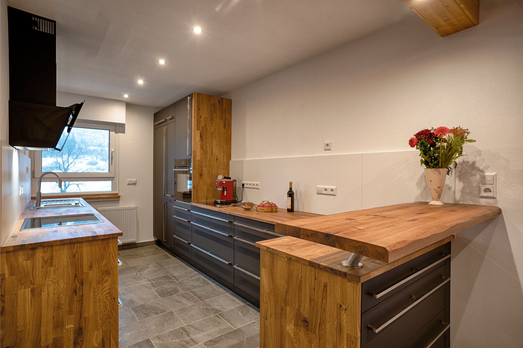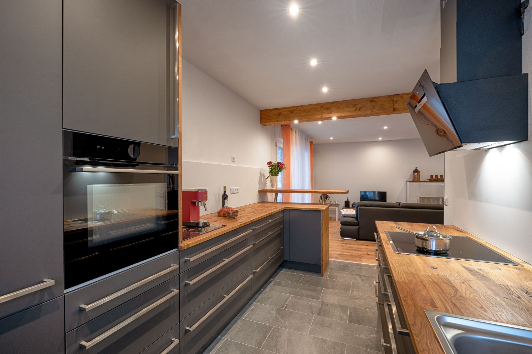 Die funktionale Aufteilung nutzt den Raum optimal aus und bietet großzügige Arbeitsflächen sowie clever integrierten Stauraum. Hochwertige Einbaugeräte, wie der hochgestellte Backofen und das flächenbündige Kochfeld mit moderner Dunstabzugshaube, garantieren höchsten Komfort beim Kochen. Abgerundet wird das Design durch eine erhöhte Thekenlösung aus Massivholz, die nicht nur als zusätzliche Arbeitsfläche dient, sondern auch als geselliger Treffpunkt den Übergang zum Wohnbereich perfekt inszeniert.